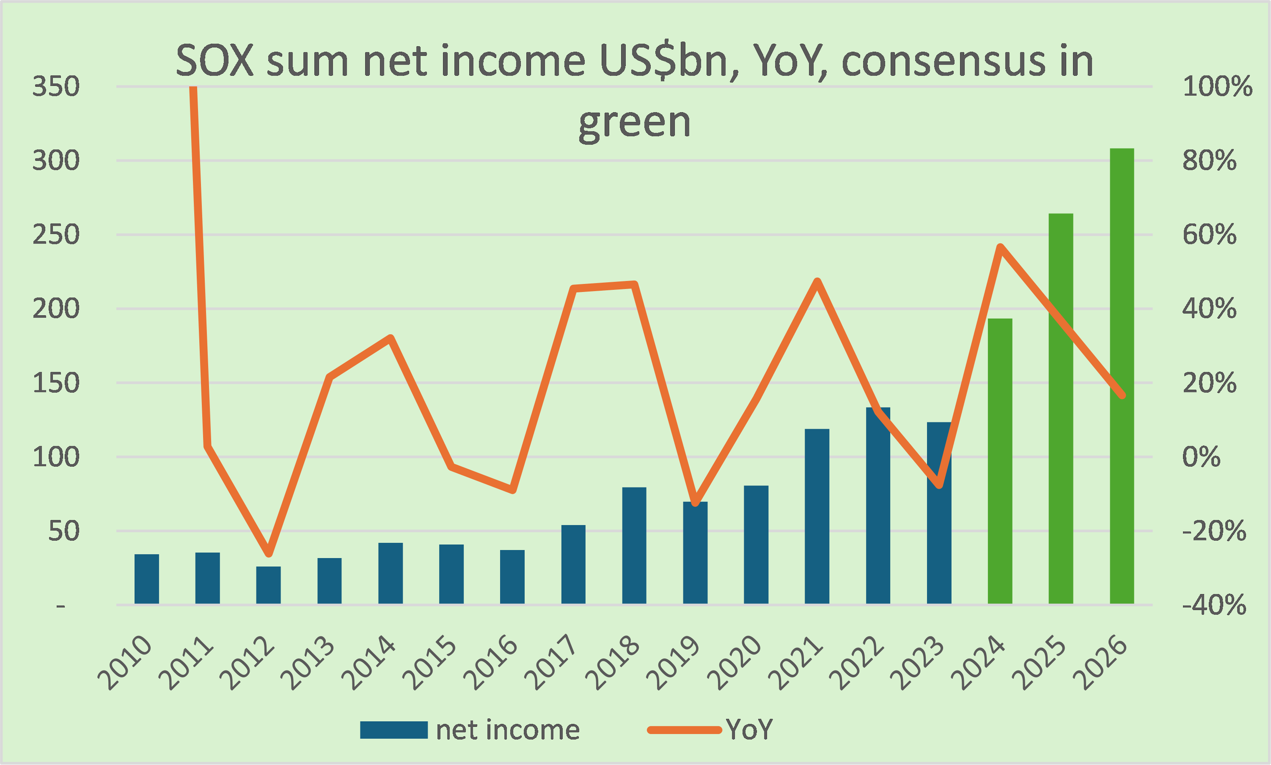 Consensus expects net income growth at 57% in 2024, 37% in 2025 and 17% in 2026. This reflects 1) AI-related AVGO, NVDA, TSM but also 2) Memory and 3) Mobile recovery as inventories are cleared and there’s a bit of end-demand growth YoY 4) some recovery in Equipment and Analog / MCU in 2025 (declining in 2024).